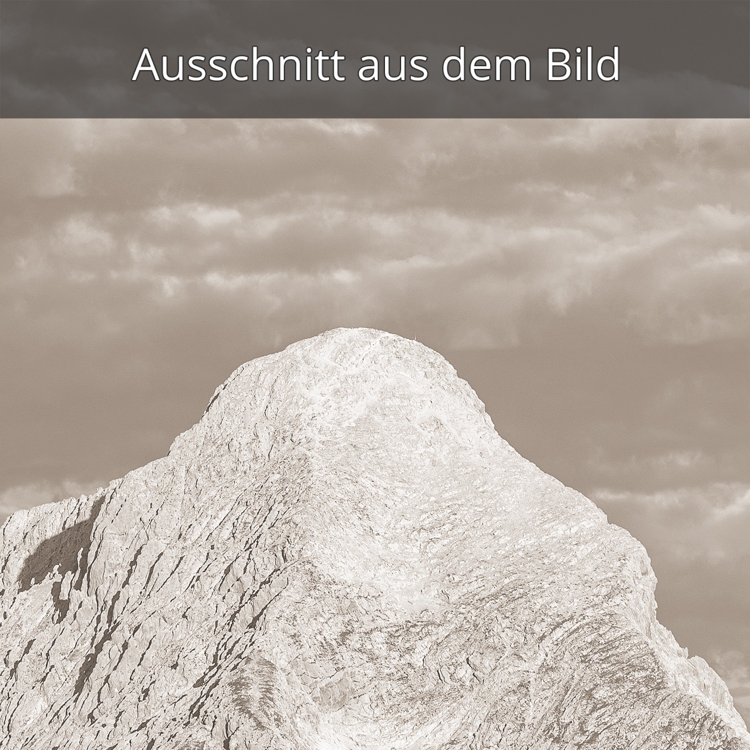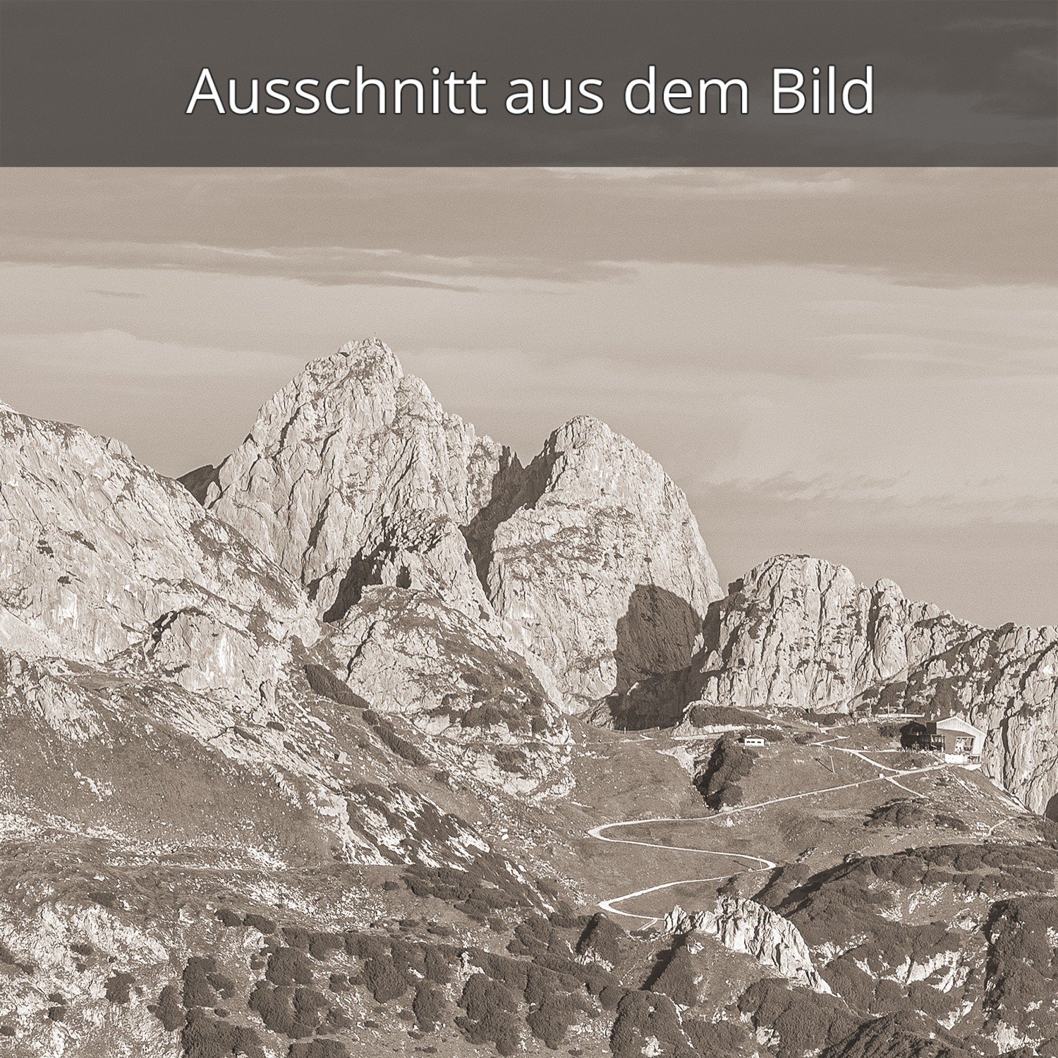 Links der Teufelsgrat mit dem Hochwanner, mittig das Zugspitzplatt mit der Zugspitze, rechts markant der Hochblassen und die Alpspitze. sepia
