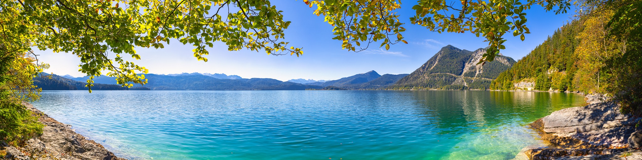 Idylle am Walchensee mit dem türkisfarbenen Wasser am Felsenufer. Die Buche im Frühherbst hängt tief über dem Walchensee.